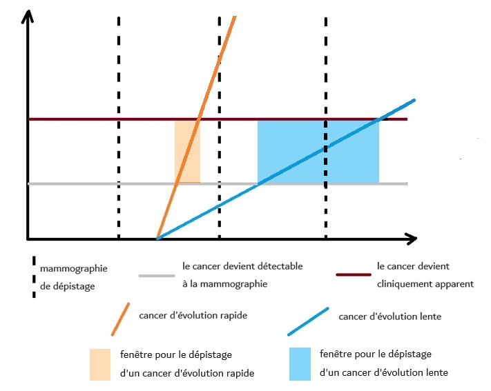 C'est ce qu'illustre la figure ci-dessous, où on voit qu'un cancer d'évolution rapide peut échapper au dépistage parce sa fenêtre est trop brève pour inclure une une mammographie de dépistage. Le cancer d'évolution lente est lui retrouvé par le dépistage parce que sa fenêtre est suffisamment longue pour inclure une mammographie de dépistage.